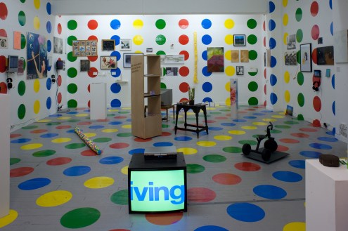 Joy Joy Join In // Installation. 400 vinyl red, blue, green and yellow spots. Embassy members’ works. Gallery visitors could play the game. Commissioned text by Neil Cooper: Games Without Frontiers. Embassy Members’ Show, 2013